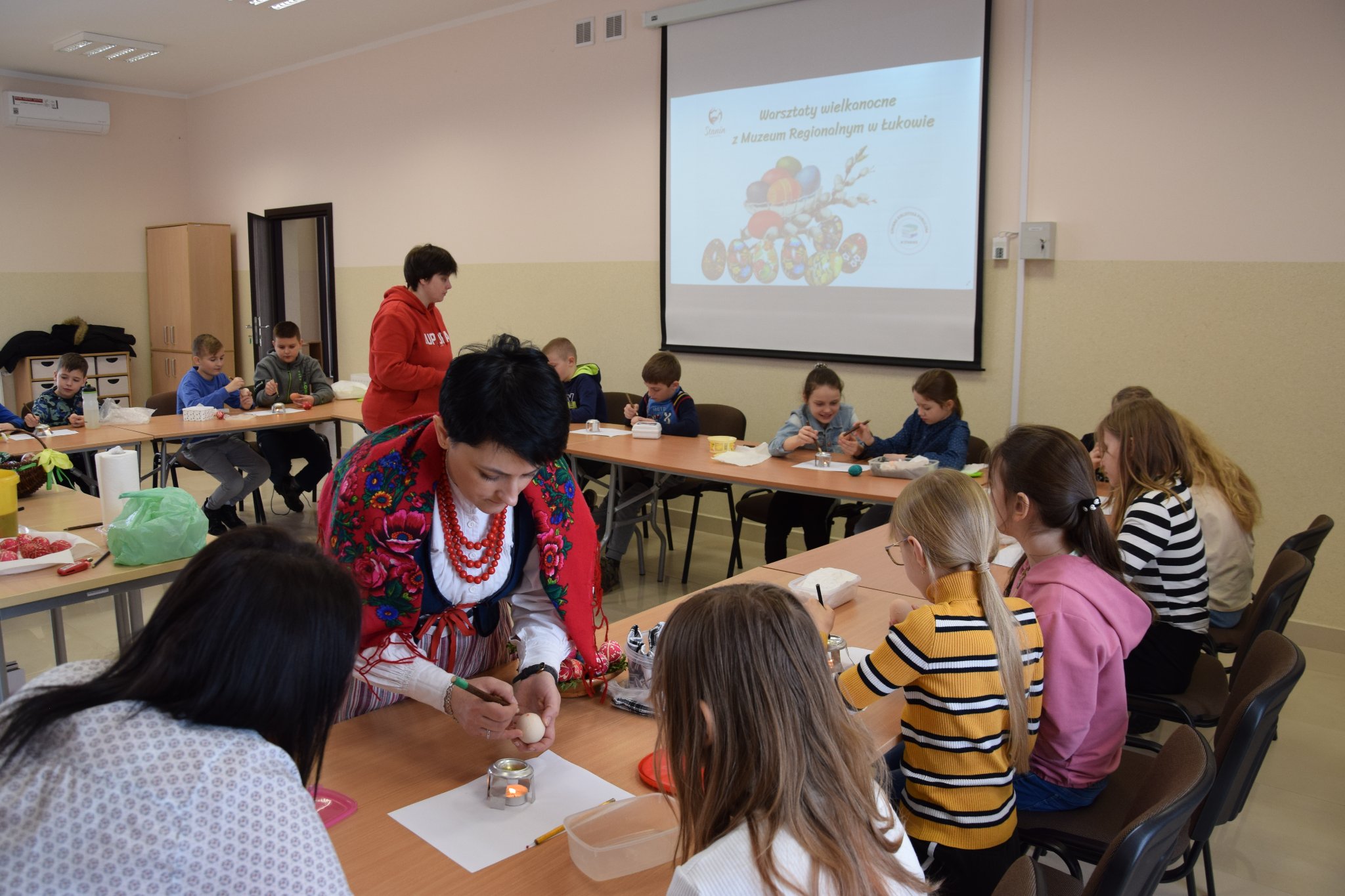 W Wielkanocny klimat wprowadziły nas warsztaty zdobienia jajek metodą batikową. W zajęciach udział wzięli uczniowie z ZS w Staninie. Warsztaty poprowadziła Pani Edyta Sak- pracownik Muzeum Regionalne w Łukowie, przybliżając uczestniczkom jedną z najstarszych technik ozdabiania pisanek, polegającą na nakładaniu na skorupkę jajka gorącego wosku przy pomocy szpilki.